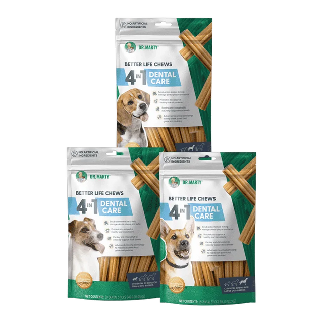 Freshen your dog's breath and shine their teeth with Dr Marty's Better Life 4 in 1 Premium Dental Care Chew Treats. Crafted with advanced probiotics, these dental chew sticks fight plaque-causing bacteria and micro scrubbing enzymes loosen grime and chlorophyl to promote better breath.