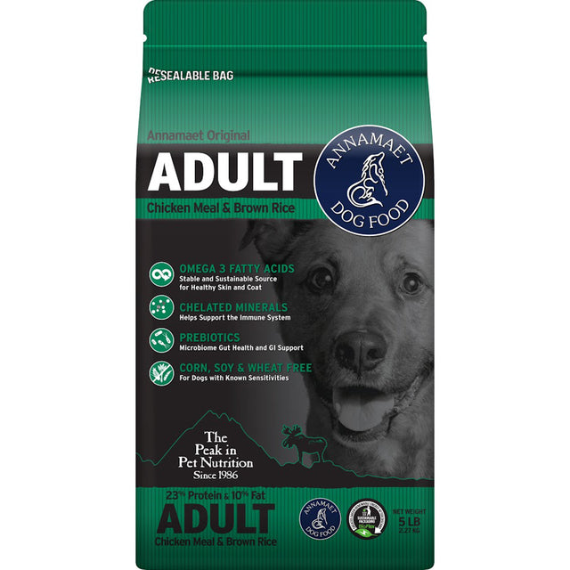 Support your adult dog's health and vitality with a high-quality formula crafted for their everyday needs. Annamaet Original Adult Formula is a clean, balanced formula that combines premium chicken and brown rice with science-backed nutrition to help maintain lean muscle, promote digestion, and support immune function—without any corn, wheat, or soy.