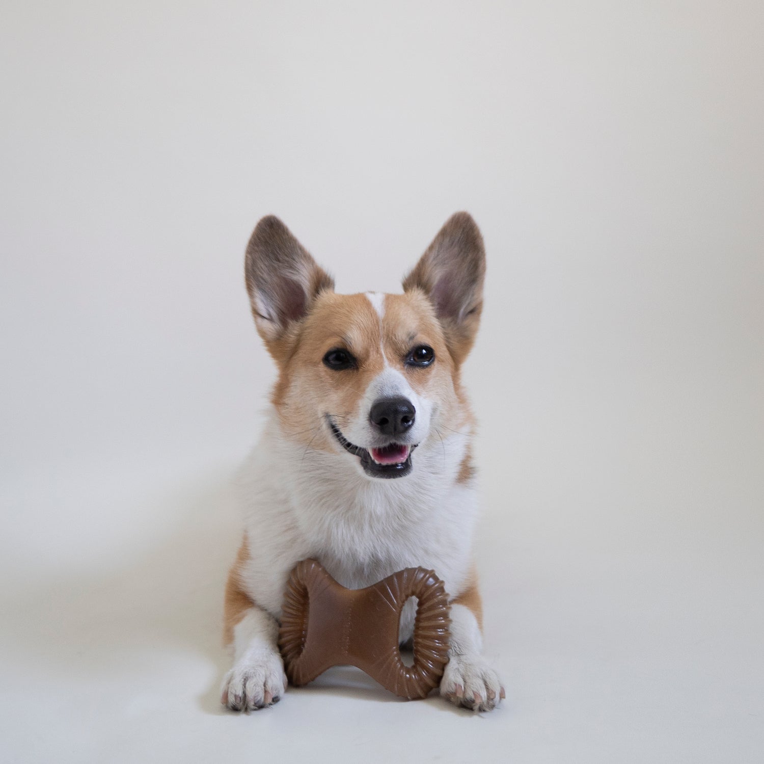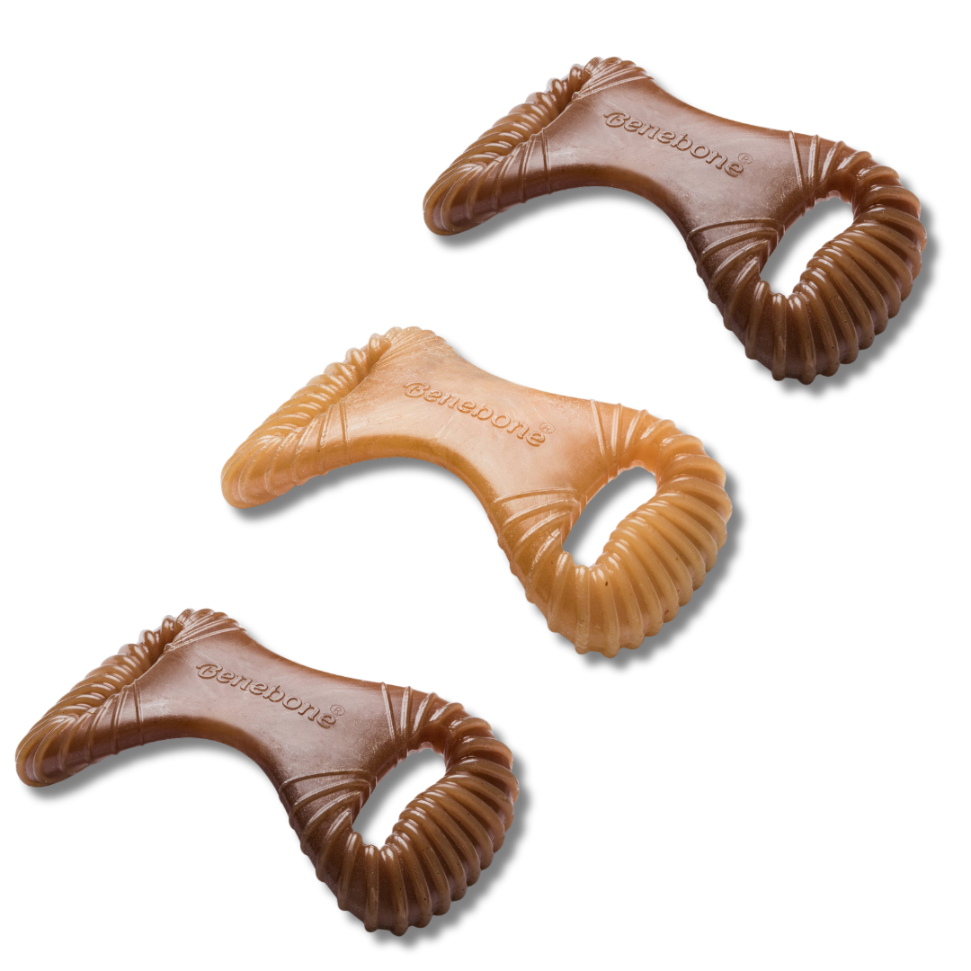 Benebone is a flavored dog chew that will please dogs for hours. Benebones are curved to allow dogs to pop-up one end and get a satisfying chew going. It has deep grooves which allow pups to get a good bite, and increased surface area for improved scent and flavor. This shape is so special, it’s patented! Benebone supports canine welfare, in particular dog shelters throughout the USA. Made in USA. Product should be whole and intact at all times. Replace at first sign of reasonable wear, such as deep teeth marks, cracks, or any sign of breaking apart. *Made in a facility that may also be in contact with nuts. As a precaution, do not introduce to a household with a nut allergy of any kind.