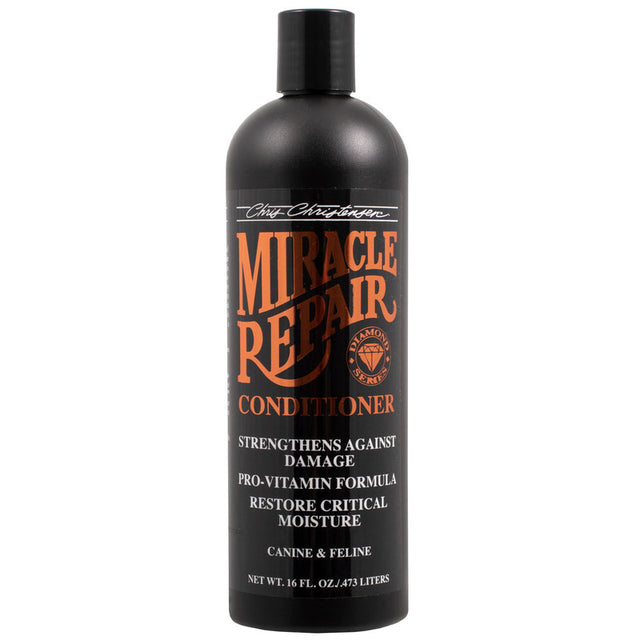Chris Christensen Miracle Repair Conditioner is packed with antioxidants and pro-vitamins designed to strengthen brittle coats and prevent future damage from grooming and environmental factors. Part of the Diamond Series line of professional grooming products, this pro-vitamin formula restores critical moisture to canine and feline coats. For best results, use this product in conjunction with Chris Christensen Diamond Series Miracle Repair Shampoo.