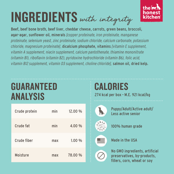 Beef, beef bone broth, beef liver, cheddar cheese, carrots, green beans, broccoli, agar-agar, sunflower oil, minerals [copper proteinate, iron proteinate, manganese proteinate, selenium yeast, zinc proteinate, sodium chloride, calcium carbonate, potassium chloride, magnesium proteinate], dicalcium phosphate, vitamins [vitamin E supplement, vitamin A supplement, niacin supplement, calcium pantothenate, thiamine mononitrate (vitamin B1), riboflavin (vitamin B2), pyridoxine hydrochloride (vitamin B6), folic acid, vitamin B12 supplement, vitamin D3 supplement, choline chloride], salmon oil, dried kelp.