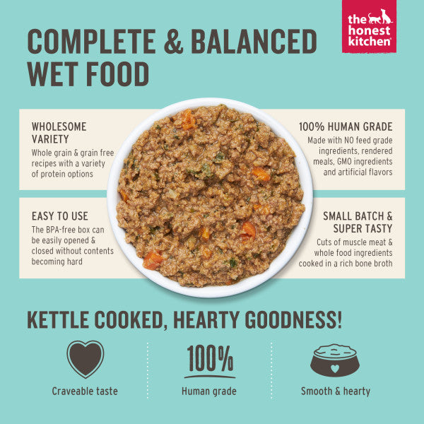The Honest Kitchen believes that health starts with human grade, whole foods. Each recipe is 100% Human Grade and Complete and Balanced. The The Honest Kitchen Butcher Block Pâtés are made with nutrient-dense meat, plus fiber rich fruits and veggies for irresistible taste. Serve them as complete meals or nutritious toppers that help boost your pup's health and happiness from the inside out.