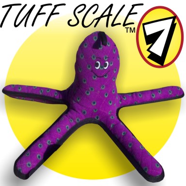Scoring a mighty 7 on Tuffy's DURASCALE, the large Ocean Octopus is a soft, yet strong plush dog toy. Part of the Tuffy Mighty Ocean Creatures collection, this super fun toy features multiple layers of material, including a soft, plush outside, and a layer of heavy fleece underneath - giving it extra strength. Tuffy Ocean Octopus' 7 out of 10 rating makes it a really tough dog toy, but still slightly vulnerable to the TUFFest players.